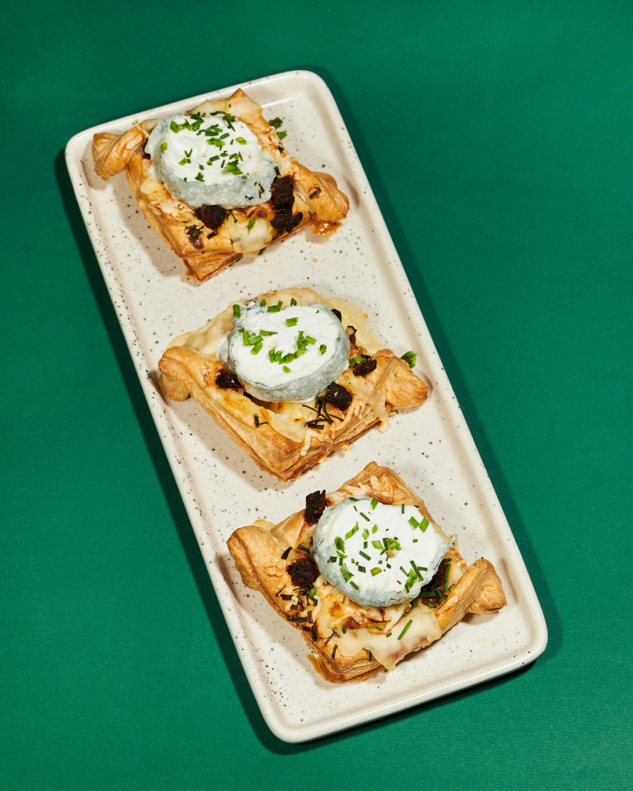 Étaler le feuilletage à 2 mm au laminoir. Détailler des carrés de 10×10 cm.
