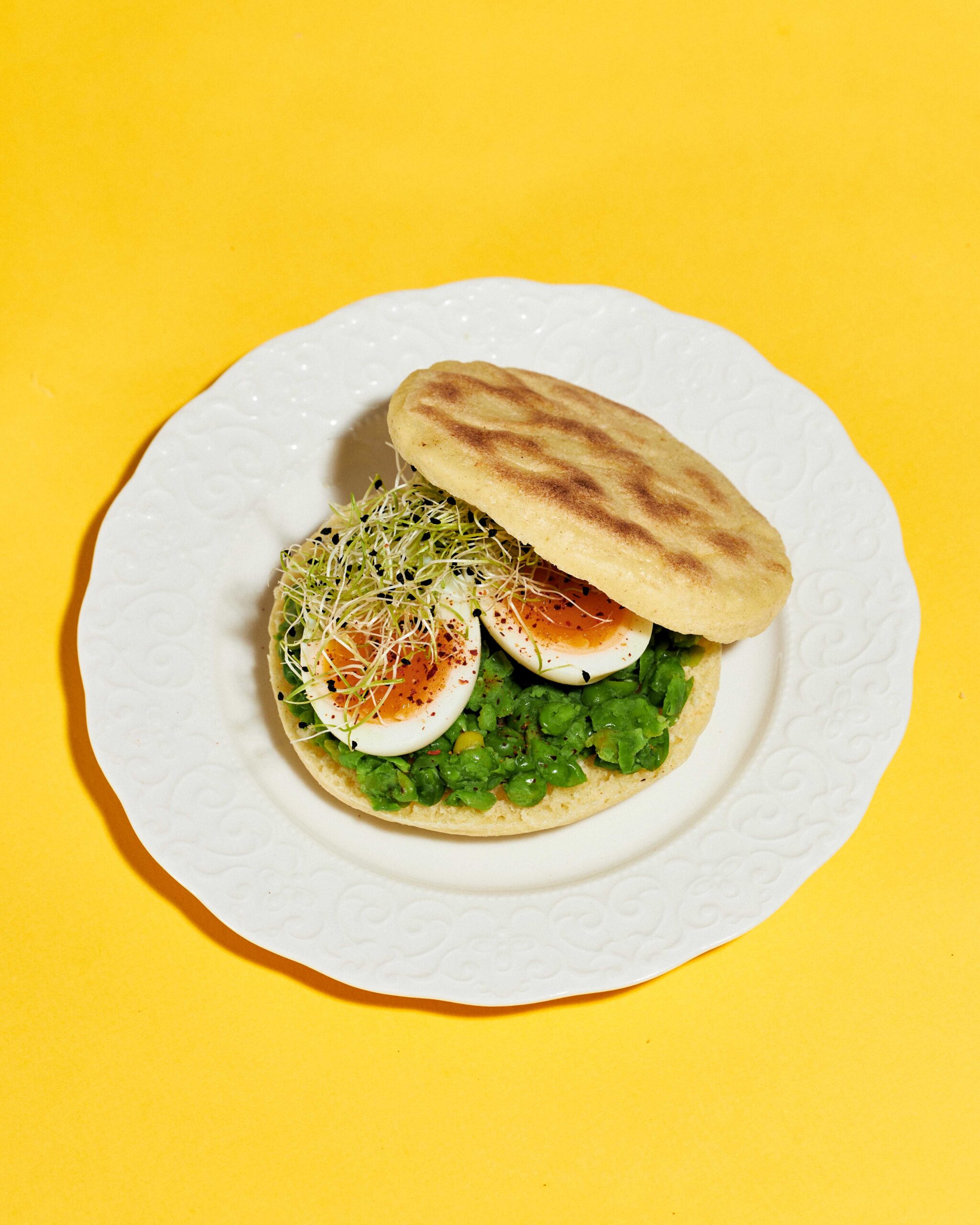 Écraser les petits pois avec un filet d’huile d’olive. Assaisonner à votre convenance. Faire cuire un oeuf mollet (ou à la poêle selon vos goûts).