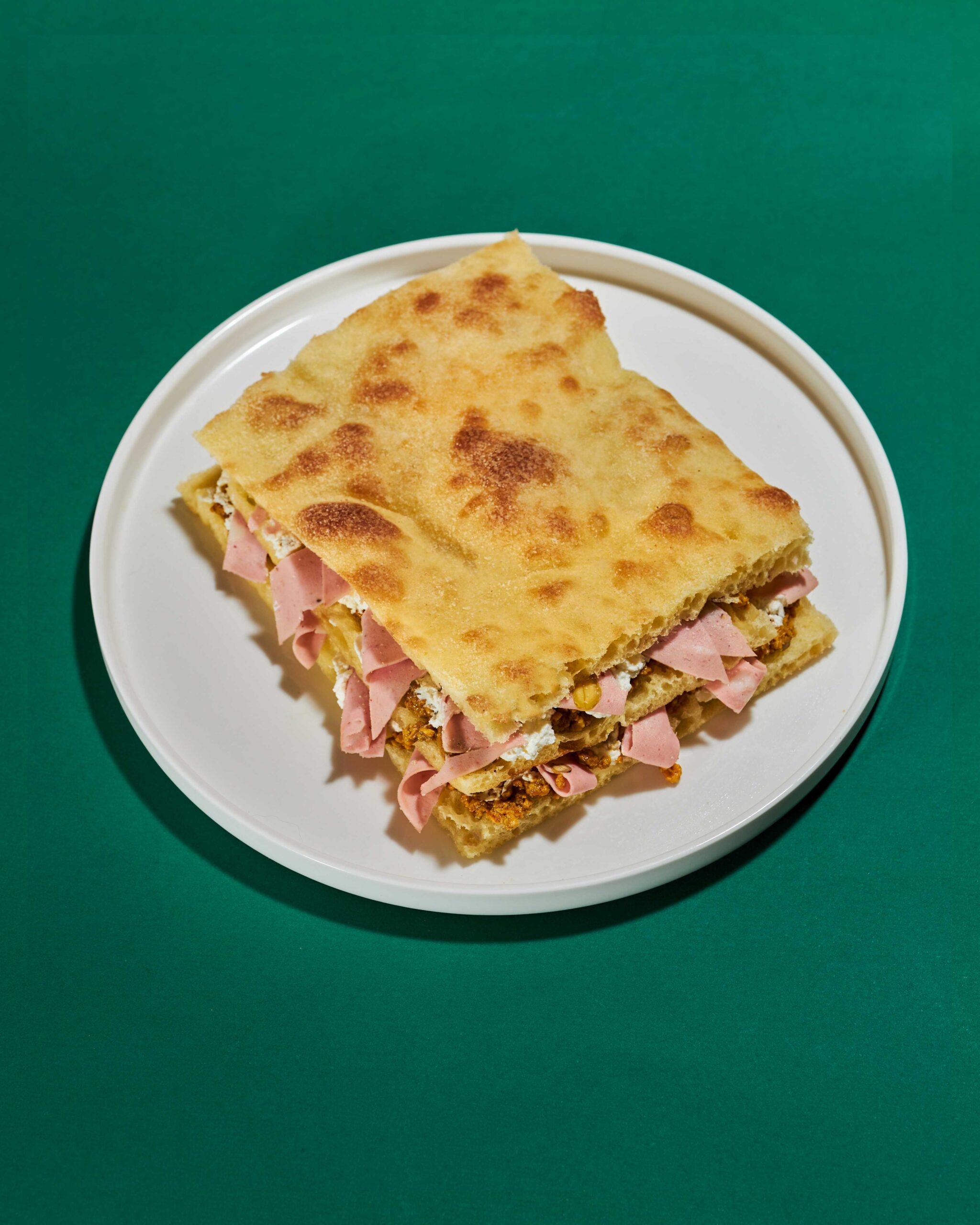 Découper en 2 la schiacciata, étaler le fromage frais puis la crème de pistache. Installer les tranches de mortadelle. Refermer. Couper en portion individuelle.