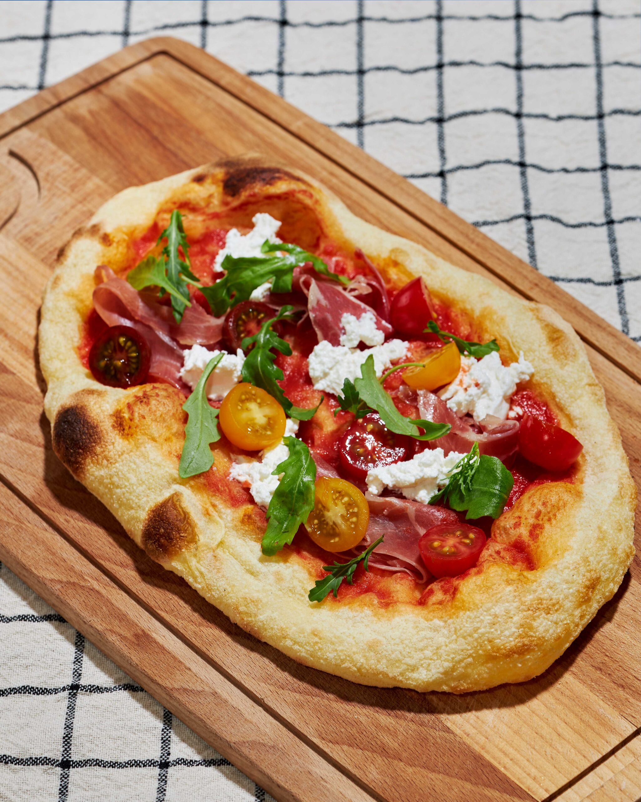 Détailler en pâtons de 175 g pour une pinsa d’environ 23 x 12 cm.