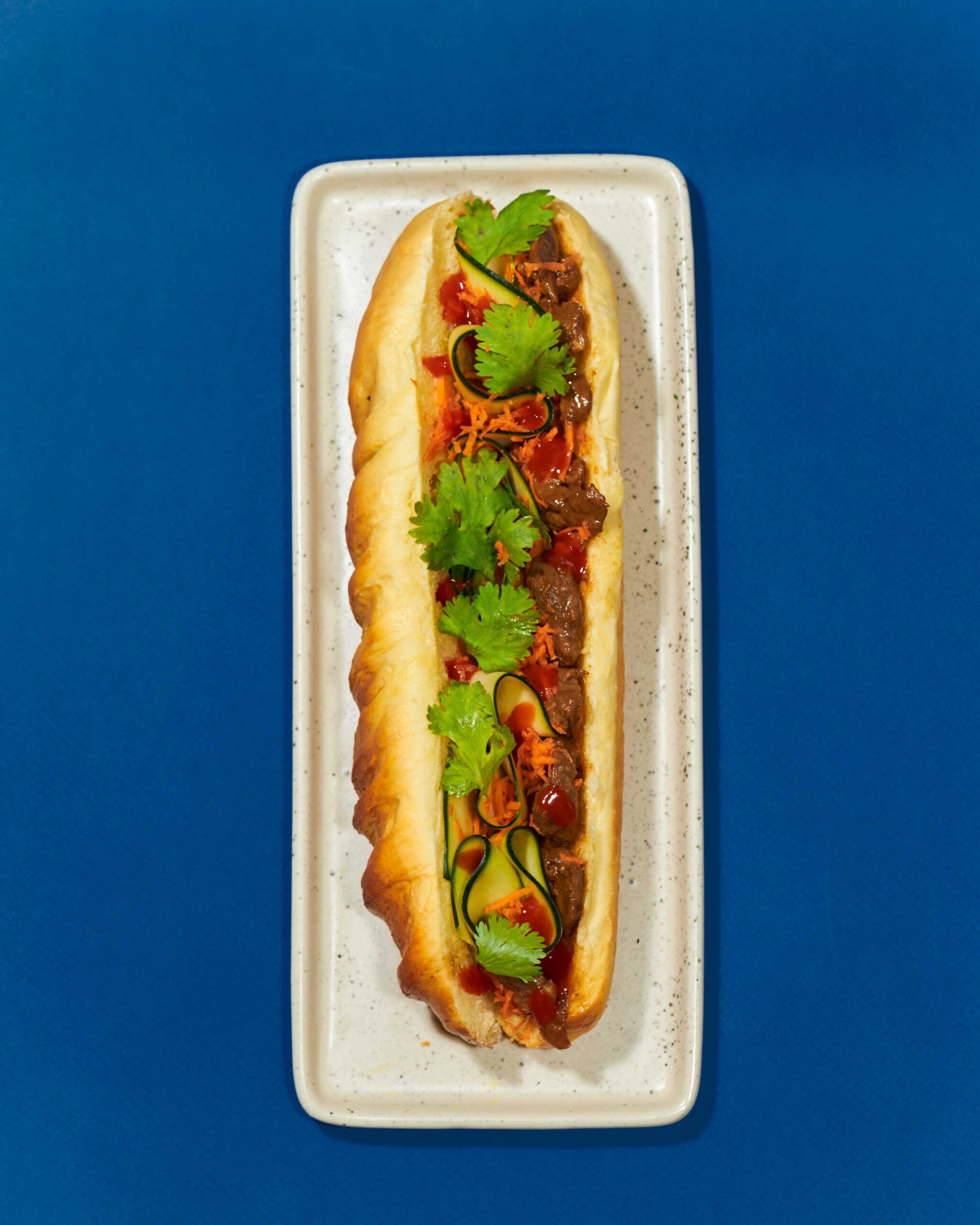 Étaler le beurre de cacahuète, disposer les morceaux de boeuf, la carotte râpée, les lanières de courgette crue. Assaisonner avec la sauce Sriracha par touche et ajouter la coriandre en dernier.